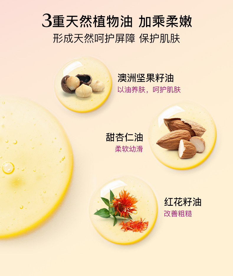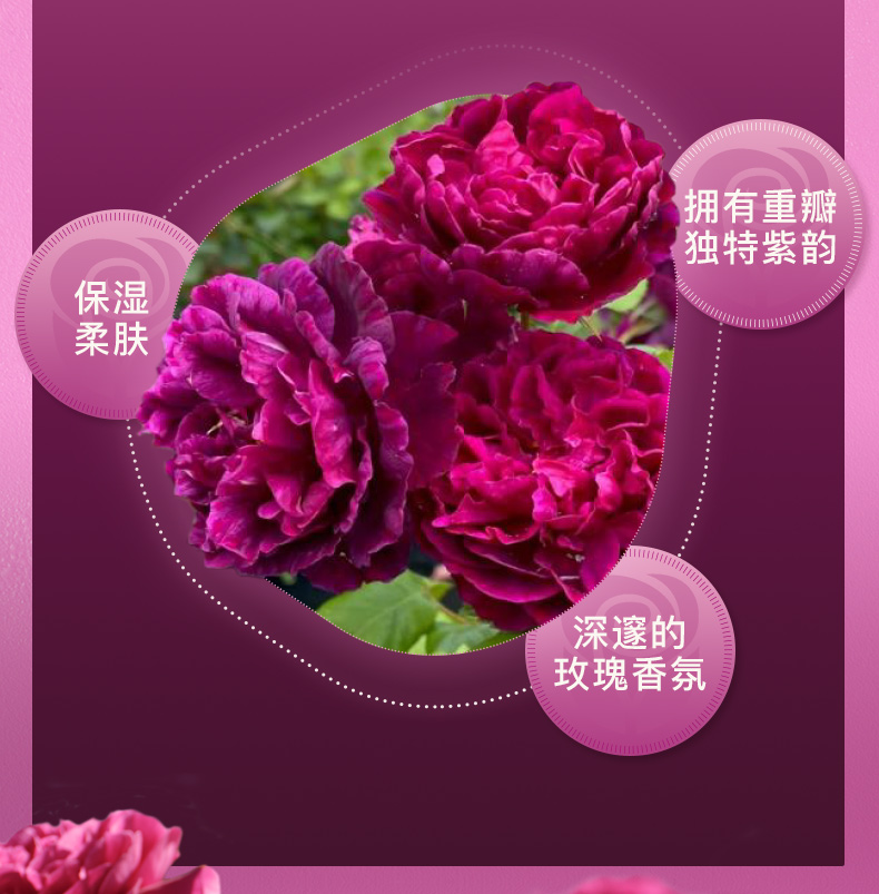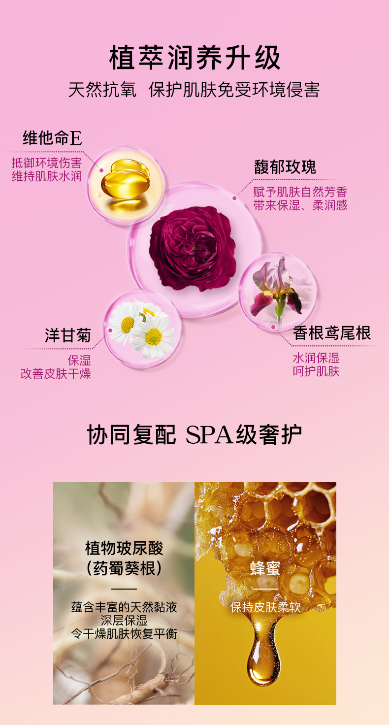 馥郁玫瑰菁萃、药蜀葵根提取物、洋甘菊提取物、香根鸢尾根提取物、澳洲坚果籽油、甜杏仁油、红花籽油、蜂蜜、维他命E
