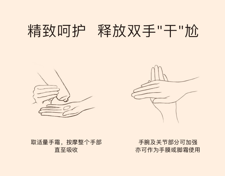 取适量的产品在手上,按摩整个手部直到充分吸收。每天可根据需要多次使用。手腕及关节部分可加强 (足部亦可使用) 。更可作为手膜使用