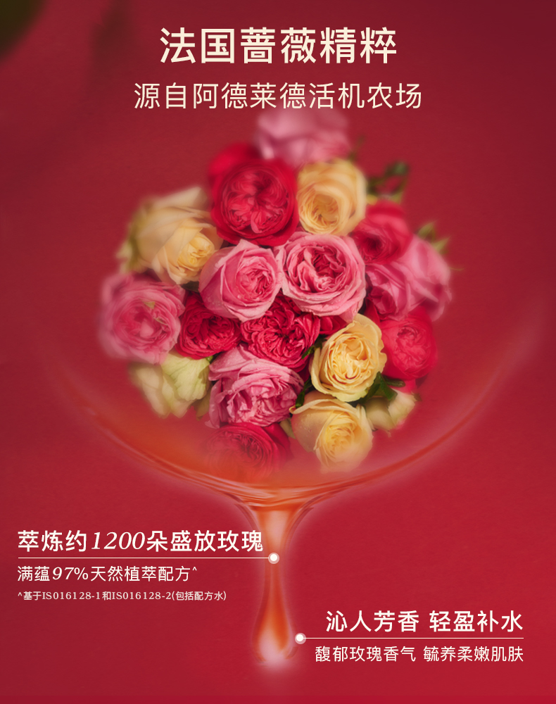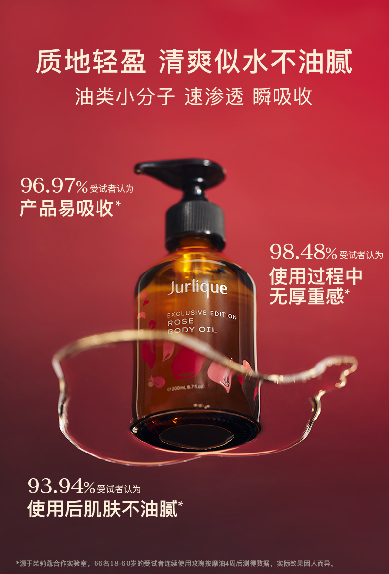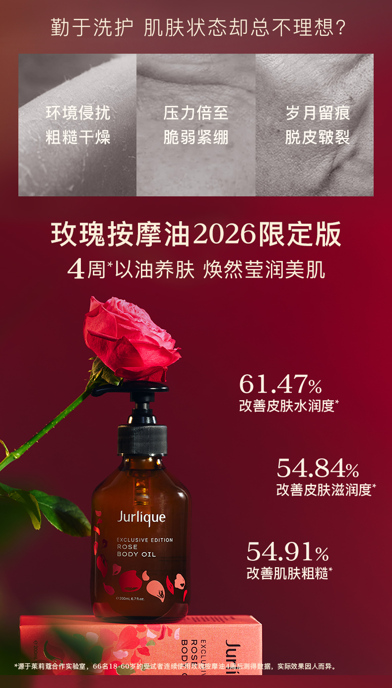 ^源于茱莉蔻合作实验室,66名18-60岁的受试者连续使用玫瑰按摩油4周后测得数据,实际效果因人而异。