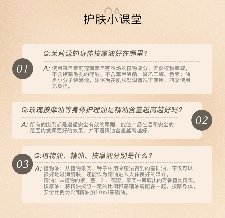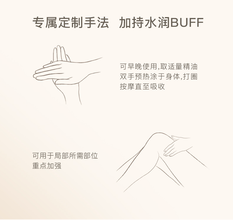 叠加使用:可在身体乳、磨砂膏中滴入2-3滴,加乘嫩肤效果