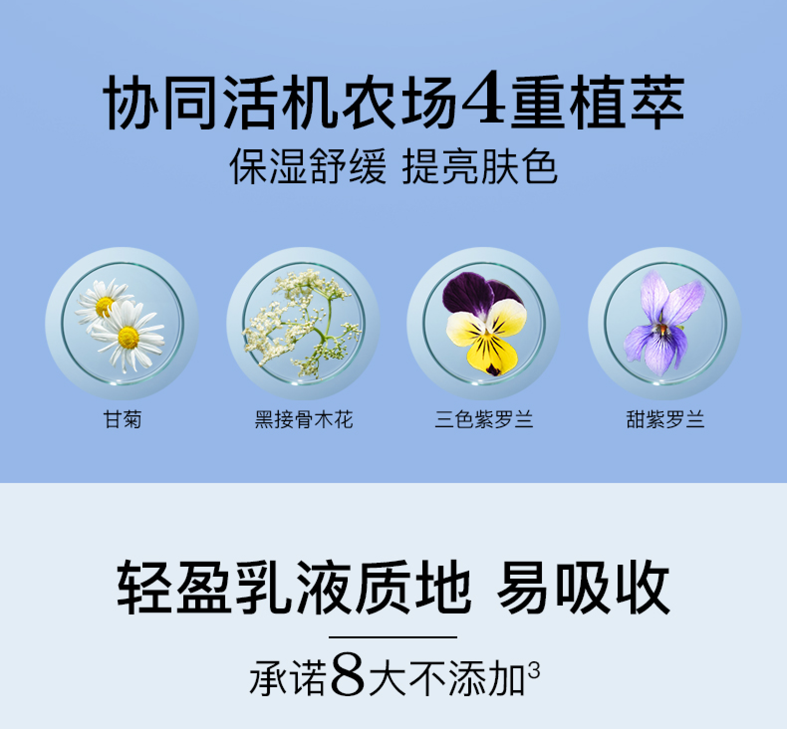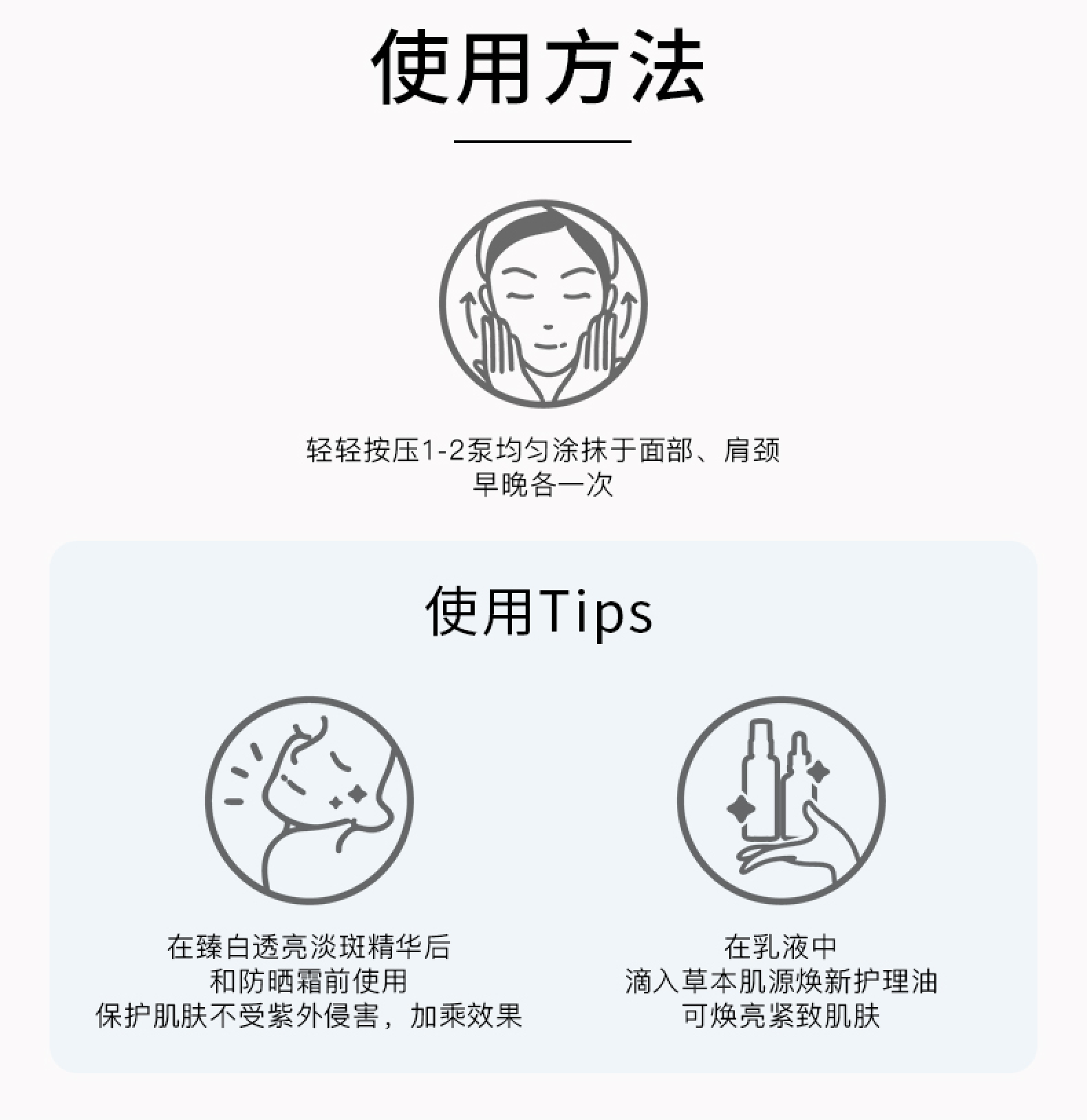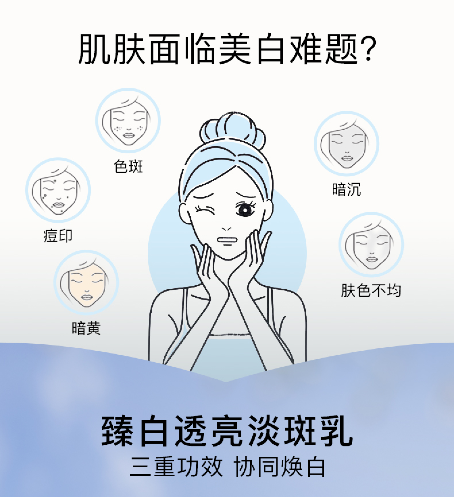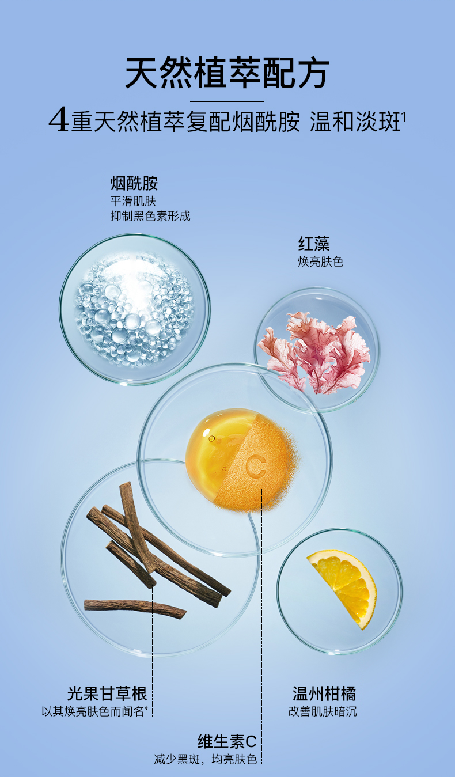 集亮白、抗氧、滋润多效合一的乳液 轻盈乳液质地,一抹吸收 蕴含4重天然植萃复配烟酰胺 保湿润泽,提亮肤色