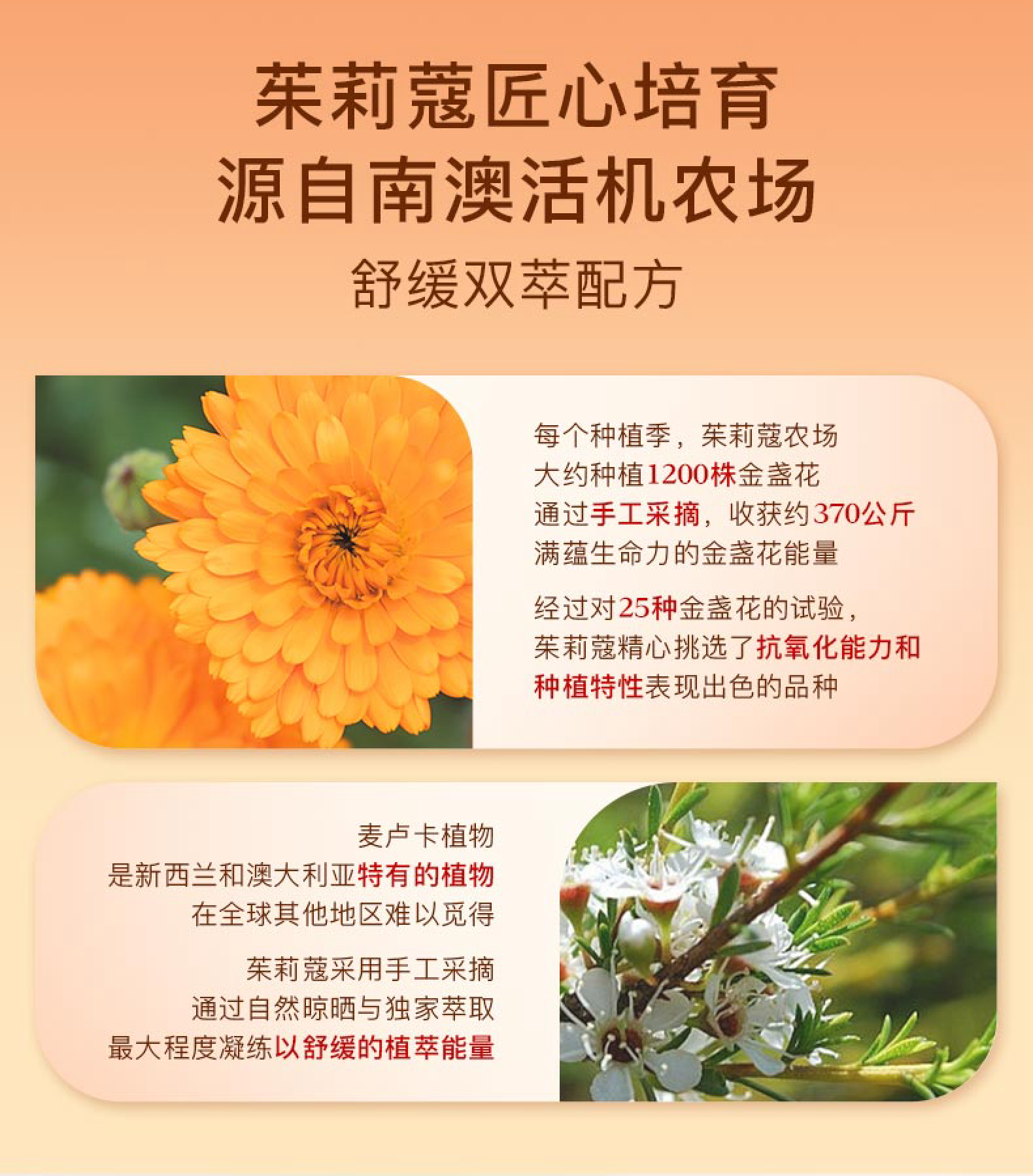 蕴含金盏花 + 麦卢卡叶植御双萃 即时急救舒缓,提升肌肤水润度 快速缓解泛红,强化肌肤保湿屏障 长效平衡,减少肌肤反复敏感
