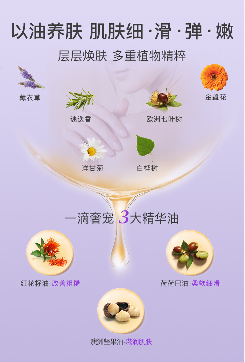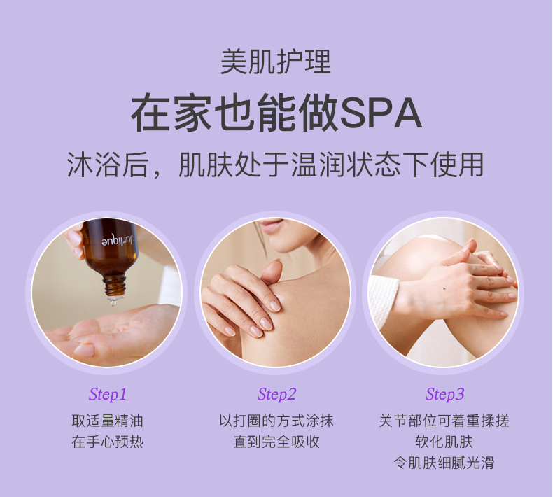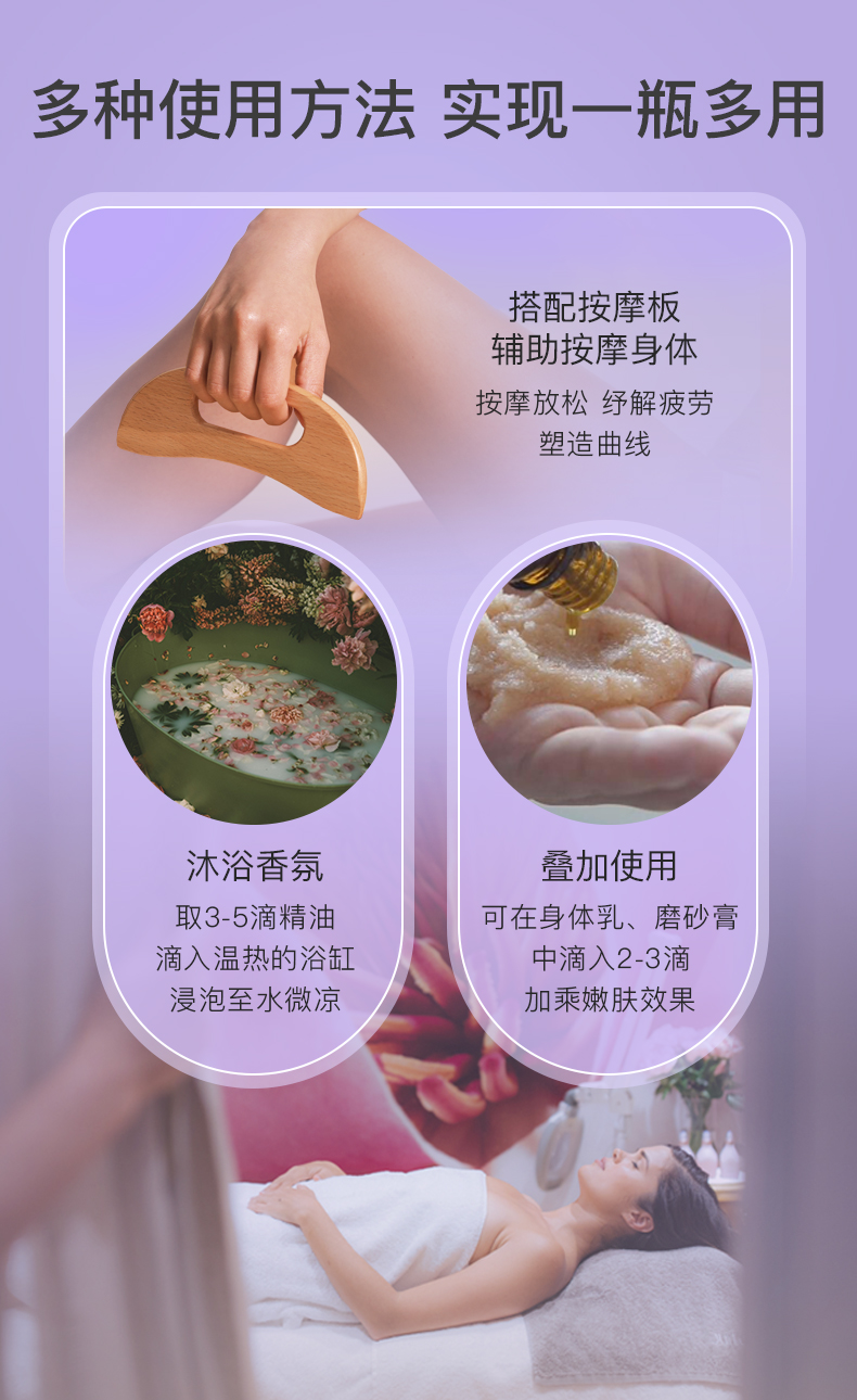 叠加使用:可在身体乳、磨砂膏中滴入2-3滴,加乘嫩肤效果