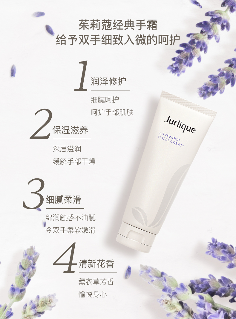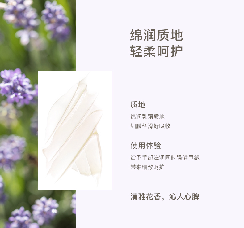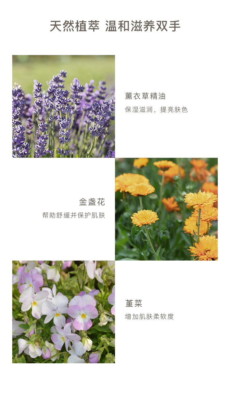 蕴含薰衣草、金盏花 及三色堇等多种植物精华 给予手部长时间的保护 和深层的滋润 令双手恢复柔软幼滑 深层保湿而无油腻感