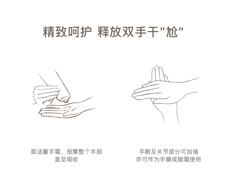 滋润、保湿、软化手部肌肤,同时为双手带来良好保护,强健甲缘
