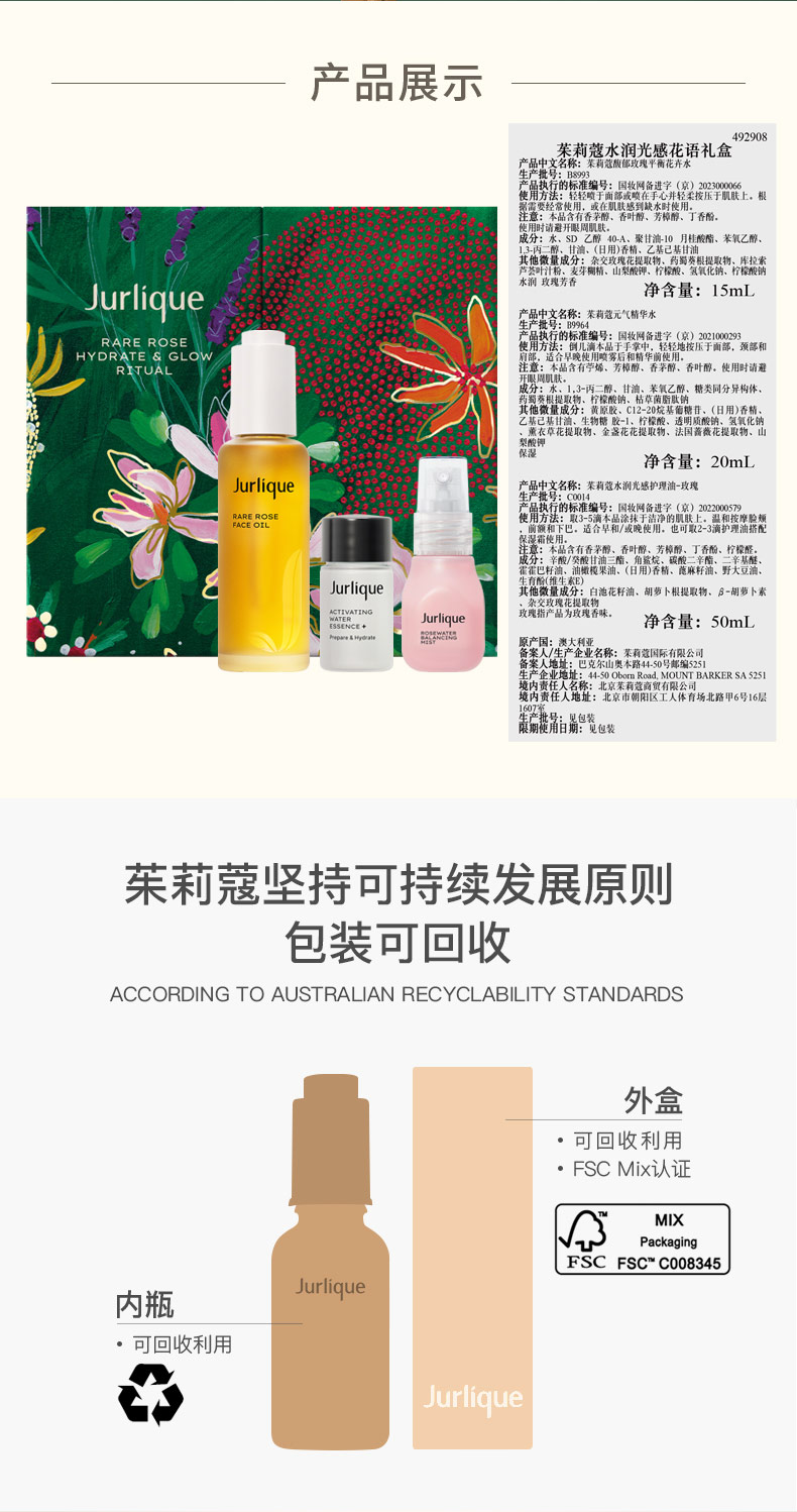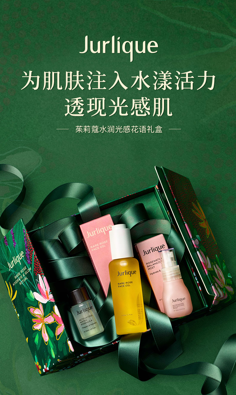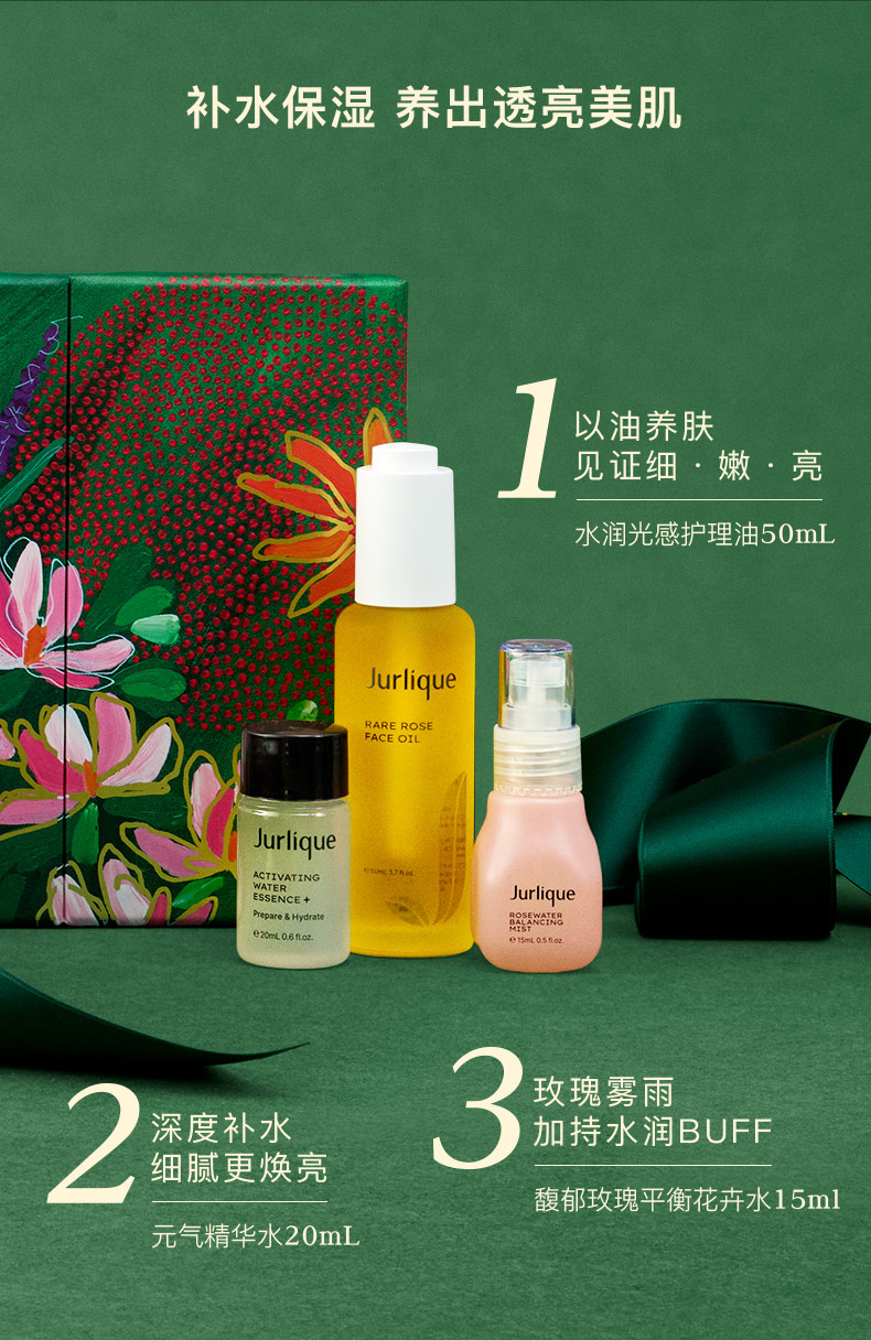 套装包含: 茱莉蔻水润光感护理油 - 玫瑰 50mL 茱莉蔻元气精华水中样 20mL 茱莉蔻馥郁玫瑰平衡花卉水中样 15mL