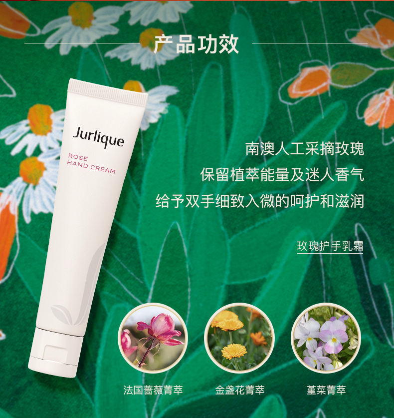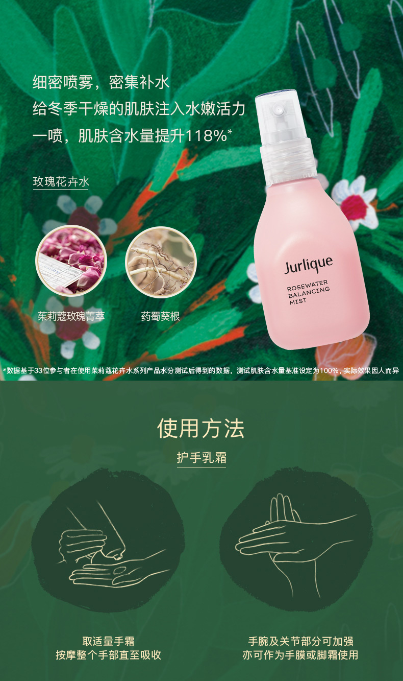 玫瑰平衡花卉水 莹润细腻的玫瑰保湿花雾 均匀在面部给干燥的肌肤注入水嫩活力 玫瑰护手霜 凝蕴独家玫瑰,保留植萃能量及迷人香气 给予双手长效呵护和深层滋润