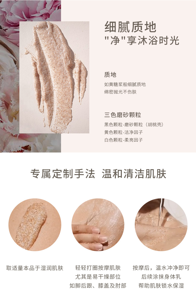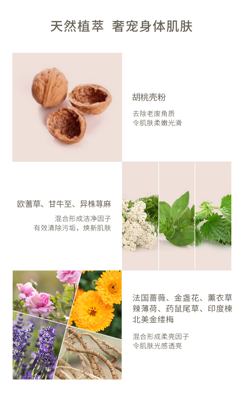 将天然“微珠”融入独特凝露质地 搭配奢华草本配方 于去角质同时滋润强韧肌肤 经典玫瑰香气更唤活感官 令一年初始的身、心、肌美如初见